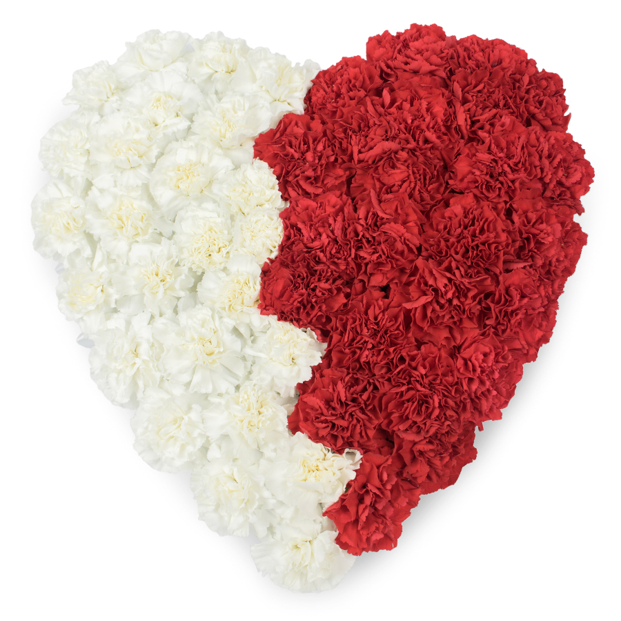 Express your sentiments with our Delicate Mixed Carnations Heart Bouquet. This refined arrangement showcases a beautiful mix of white and red carnations, elegantly arranged into a heart shape to symbolize love, respect, and compassion.